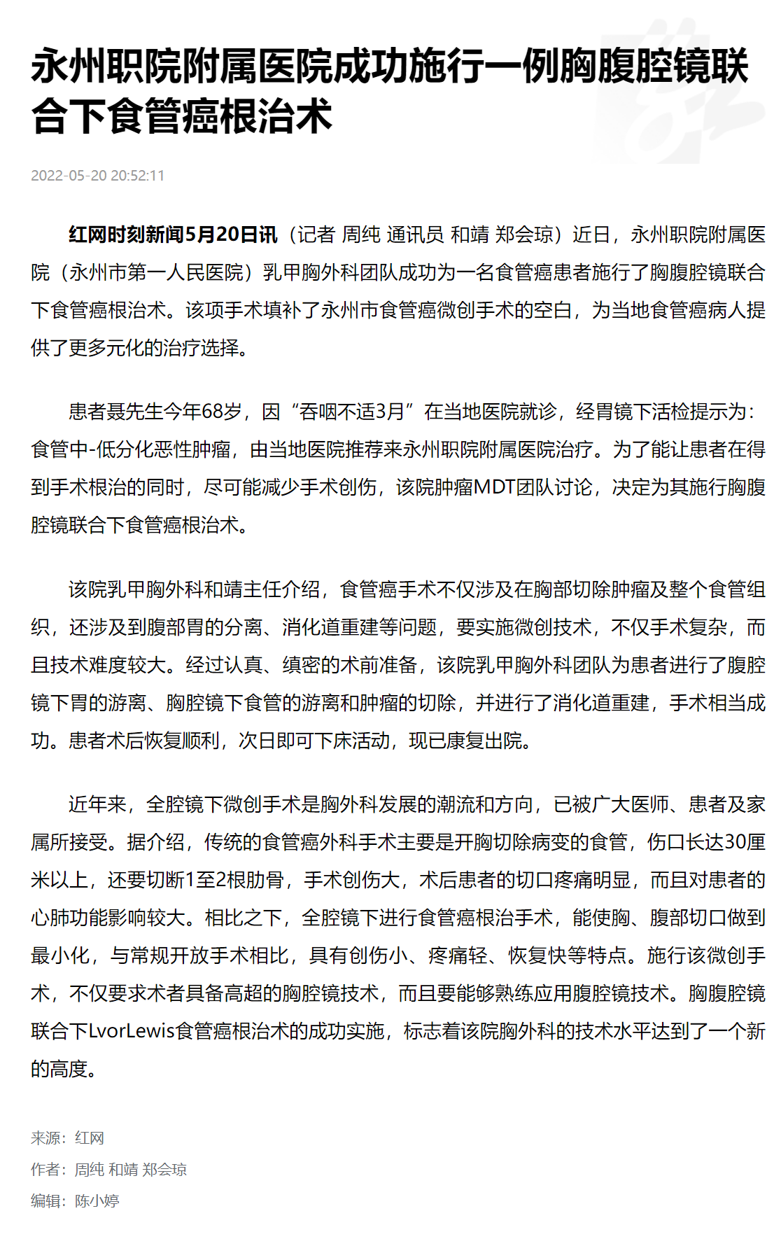 红网时刻新闻5月20日讯(记者 周纯 通讯员 和靖 郑会琼)近日,永州职院附属医院(永州市第一人民医院)乳甲胸外科团队成功为一名食管癌患者施行了胸腹腔镜联合下食管癌根治术。该项手术填补了永州市食管癌微创手术的空白,为当地食管癌病人提供了更多元化的治疗选择。