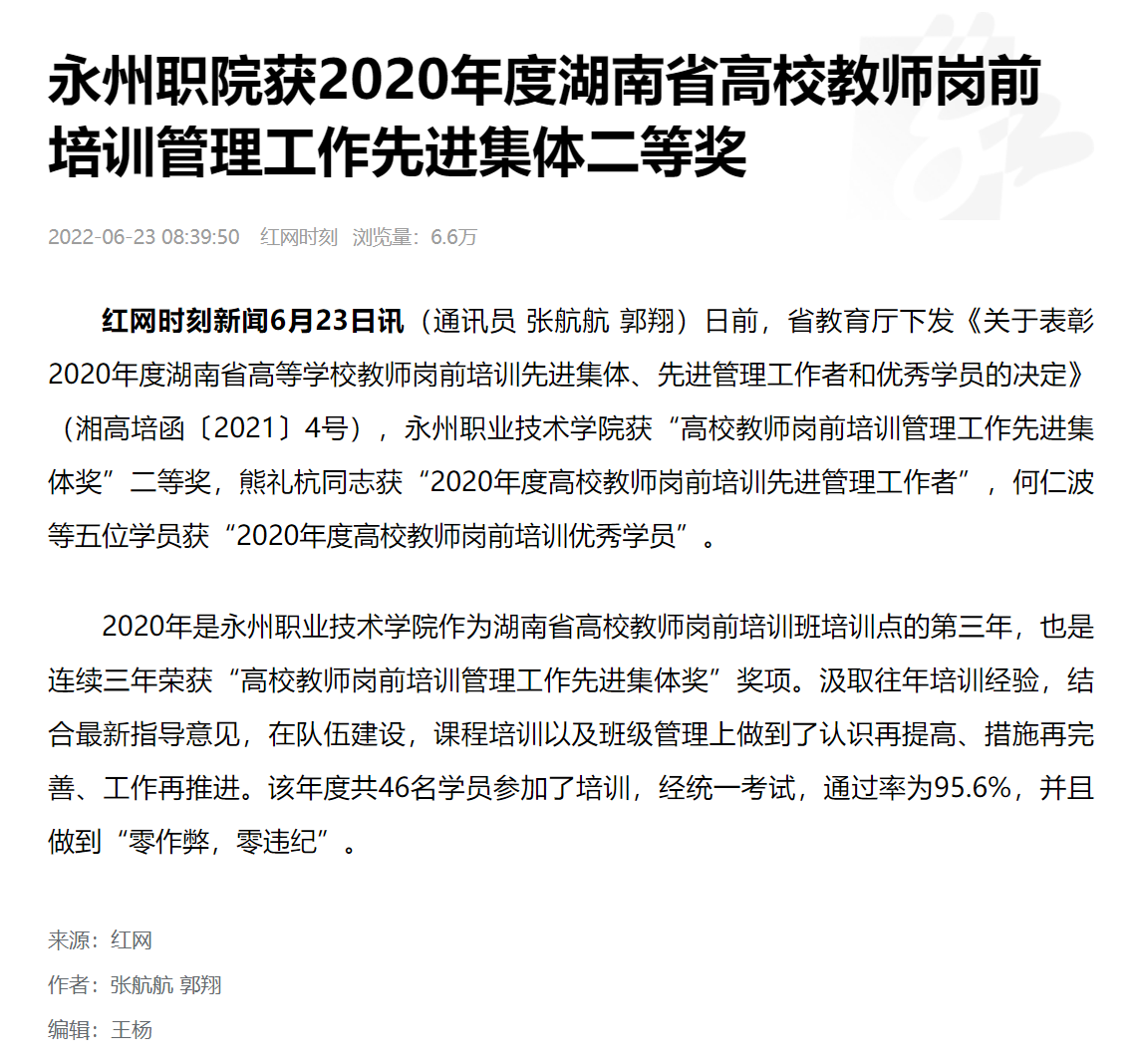 红网时刻新闻6月23日讯(通讯员 张航航 郭翔)日前,省教育厅下发《关于表彰2020年度湖南省高等学校教师岗前培训先进集体、先进管理工作者和优秀学员的决定》(湘高培函〔2021〕4号),太阳集团1088vip获“高校教师岗前培训管理工作先进集体奖”二等奖,熊礼杭同志获“2020年度高校教师岗前培训先进管理工作者”,何仁波等五位学员获“2020年度高校教师岗前培训优秀学员”。