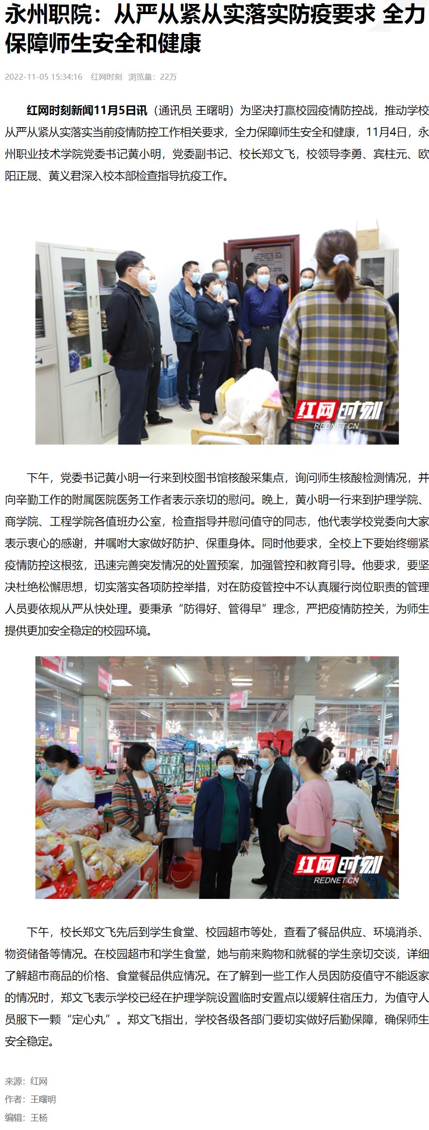 红网时刻新闻11月5日讯(通讯员 王曙明)为坚决打赢校园疫情防控战,推动学校从严从紧从实落实当前疫情防控工作相关要求,全力保障师生安全和健康,11月4日,太阳集团1088vip党委书记黄小明,党委副书记、校长郑文飞,校领导李勇、宾柱元、欧阳正晟、黄义君深入校本部检查指导抗疫工作。