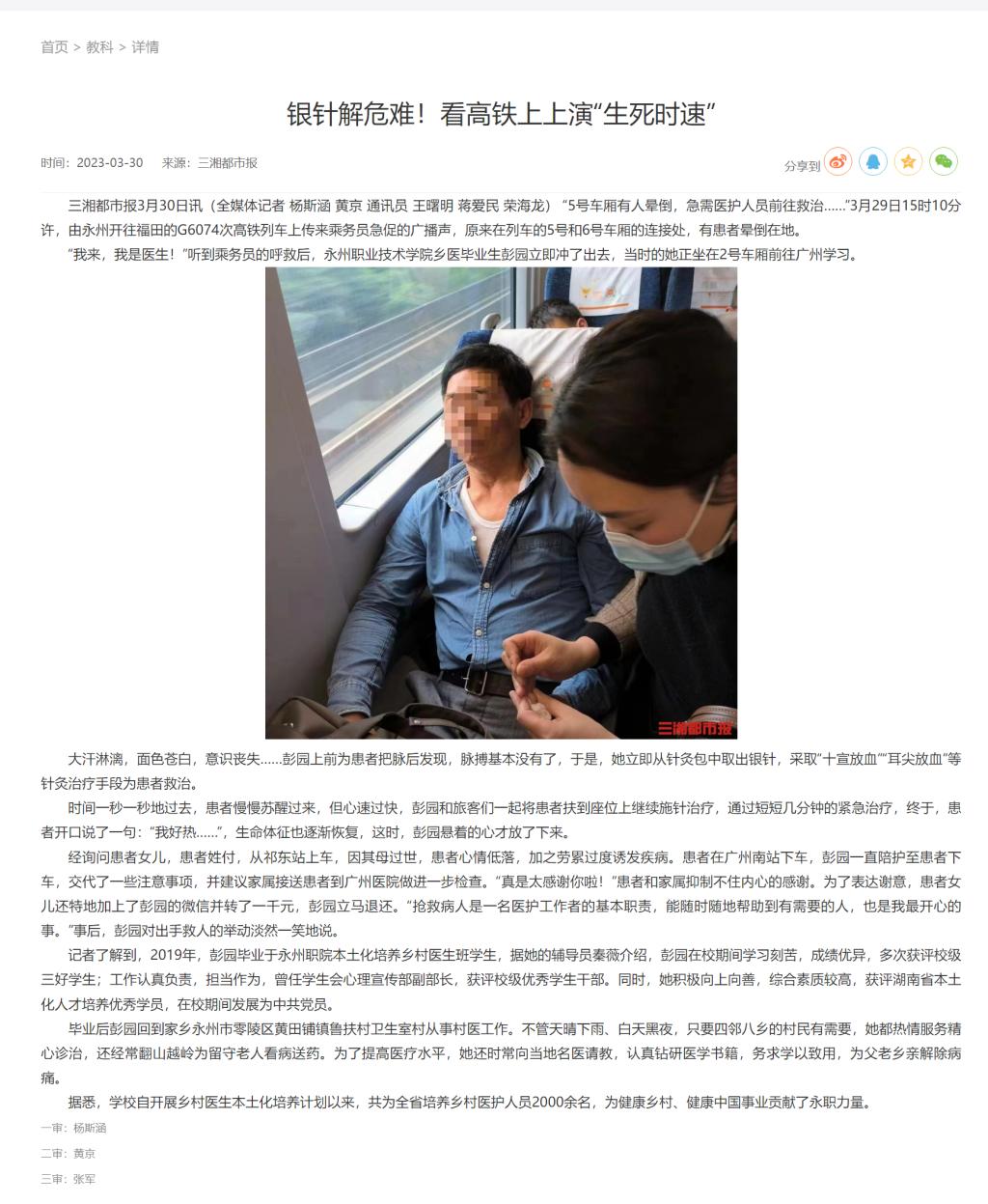 “我来,我是医生!”听到乘务员的呼救后,太阳集团1088vip乡医毕业生彭园立即冲了出去,当时的她正坐在2号车厢前往广州学习。大汗淋漓,面色苍白,意识丧失……彭园上前为患者把脉后发现,脉搏基本没有了,于是,她立即从针灸包中取出银针,采取“十宣放血”“耳尖放血”等针灸治疗手段为患者救治。