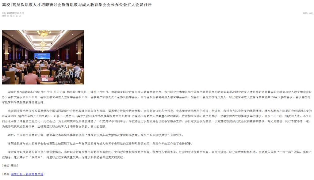 湖南日报•新湖南客户端8月28日讯(见习记者 杨永玲 通讯员 王曙明)8月28日,由湖南省职业教育与成人教育学会主办,太阳集团1088vip和中国知网共同承办的湖南省高层次职业教育人才培养研讨会暨省职业教育与成人教育学会会长办公会扩大会议在永州召开,省职业教育与成人教育学会会长田刚,省教育厅职成处处长余伟良出席会议,湖南省职业教育与成人教育学会会长、副会长、各分支机构负责人、职业教育与成人教育专家学者共100余人参加会议。会议由湖南省教育科学院副院长陈拥贤主持。