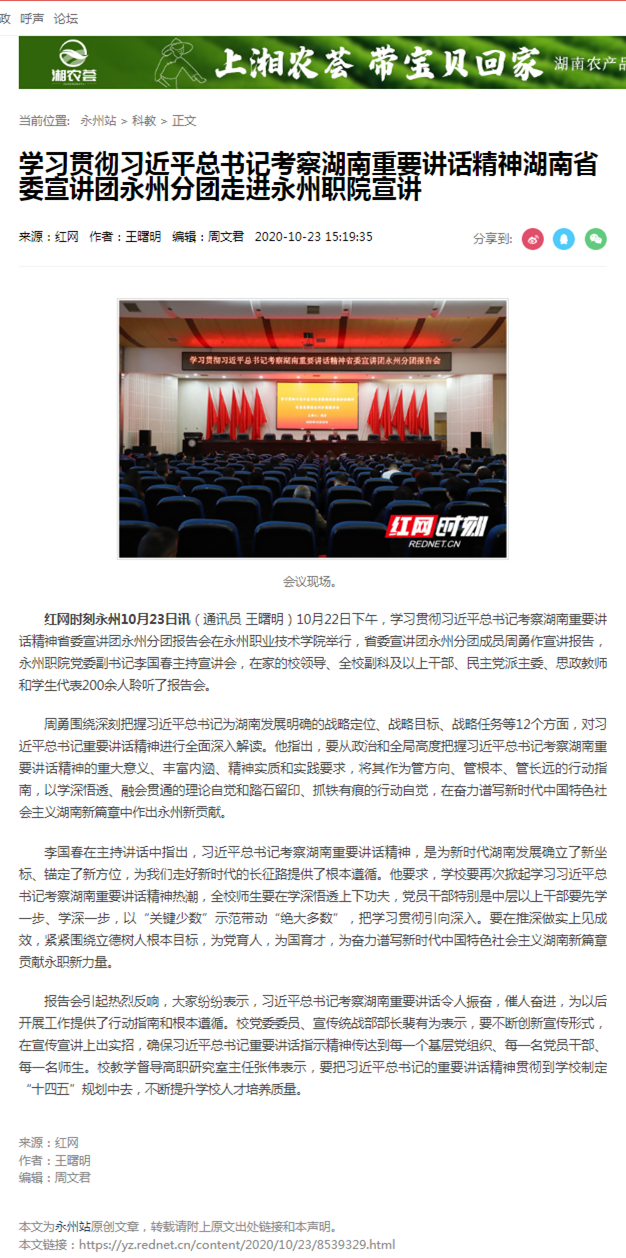 红网时刻永州10月23日讯(通讯员 王曙明)10月22日下午,学习贯彻习近平总书记考察湖南重要讲话精神省委宣讲团永州分团报告会在太阳集团1088vip举行,省委宣讲团永州分团成员周勇作宣讲报告,永州职院党委副书记李国春主持宣讲会,在家的校领导、全校副科及以上干部、民主党派主委、思政教师和学生代表200余人聆听了报告会。
