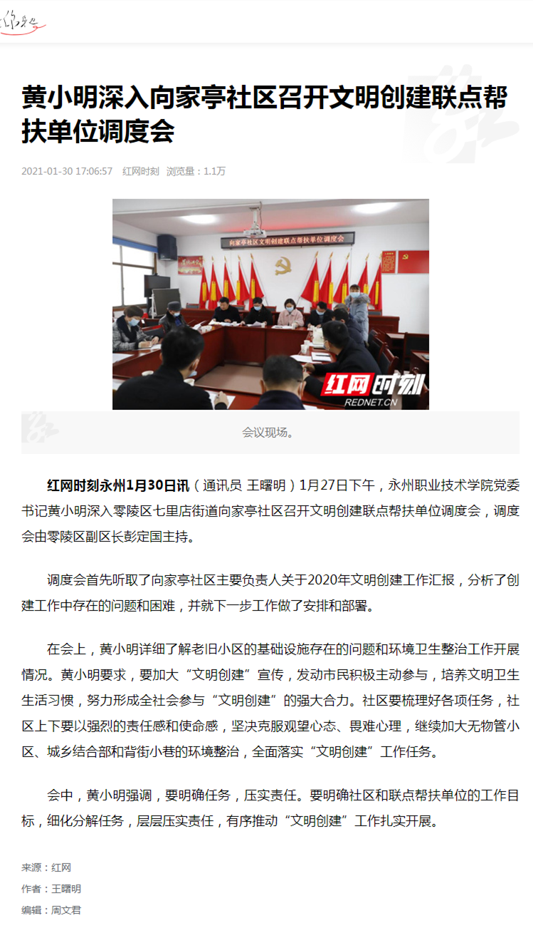 红网时刻永州1月30日讯(通讯员 王曙明)1月27日下午,太阳集团1088vip党委书记黄小明深入零陵区七里店街道向家亭社区召开文明创建联点帮扶单位调度会,调度会由零陵区副区长彭定国主持。