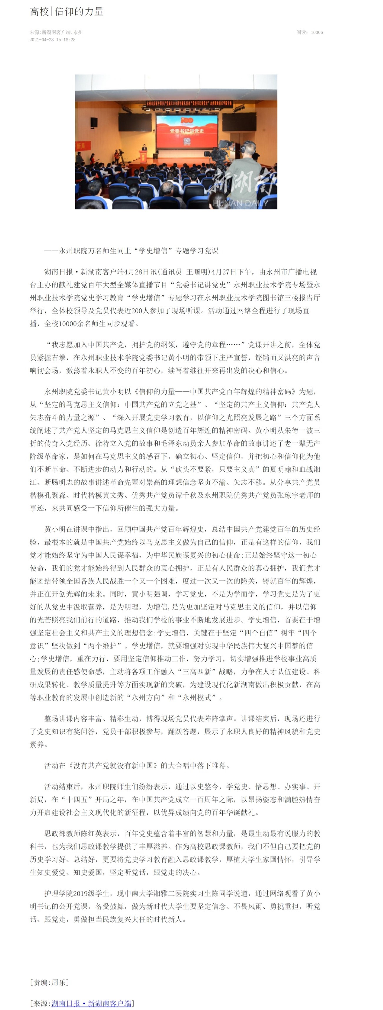 湖南日报·新湖南客户端4月28日讯(通讯员 王曙明)4月27日下午,由永州市广播电视台主办的献礼建党百年大型全媒体直播节目“党委书记讲党史”太阳集团1088vip专场暨太阳集团1088vip党史学习教育“学史增信”专题学习在太阳集团1088vip图书馆三楼报告厅举行,全体校领导及党员代表近200人参加了现场听课。活动通过网络全程进行了现场直播,全校10000余名师生同步观看。