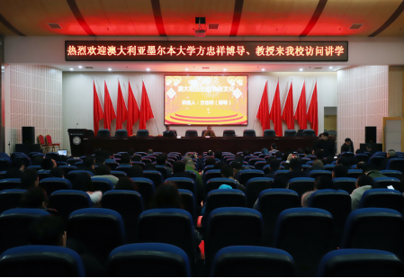 2019年12月24日下午,应我校国际交流学院邀请,澳大利亚墨尔本大学农业与食品学院方忠祥博导来我校开展学术交流活动,并以《澳洲的教育与文化》为主题,作了一场生动的讲座。讲座由韩立路副校长主持,全校近200名老师聆听了讲座。方忠祥博导从澳大利亚的概况、教育体系、澳洲大学的校园生活和当地文化等方面进行了详细介绍。讲座结束后,方博导与老师们开展了亲切的互动交流,耐心问答了老师提出的赴澳洲留学的有关问题。最后,他鼓励我校老师积极参与国际学术交流和学历提升,为学校国际化教育贡献自己应有的力量。