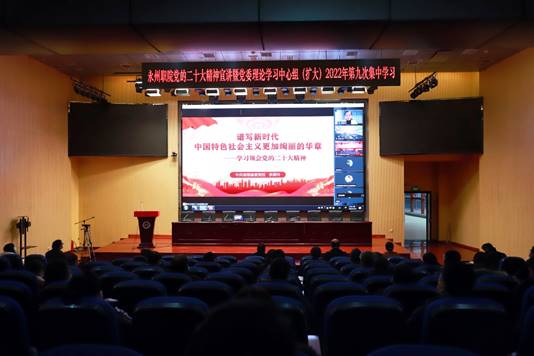 太阳集团1088vip党委副书记李勇在讲话中要求,全校上下要结合李美玲教授的宣讲报告和学校工作实际,将学习宣传贯彻二十大精神工作不断引向深入,一是要坚持学深悟透,着力领会精神实质,把思想和行动统一到党的二十大精神上来,以实际行动坚定拥护“两个确立”、坚决做到“两个维护”。二是要坚持讲好讲活,着力凝聚思想共识。全校各级各部门要发挥好宣传阵地作用,及时深入开展师生喜闻乐见的宣讲活动,讲好党的二十大精神、讲好永职故事。三是要坚持见行见效,着力推动高质量发展。切实把党的二十大精神转化为推动学校在“双高”校建设中的强大动力,奋力谱写永州职院高质量发展新篇章。