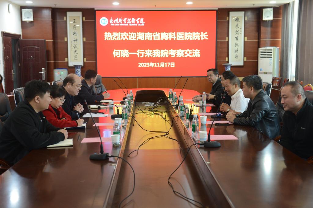 座谈会上,陈强首先代表学校对何晓院长一行的到来表示热烈欢迎,并详细介绍了学校发展历史、专业设置、办学特色以及近年来取得的主要成绩。陈强表示,感谢湖南省胸科医院多年来对学校学生实习、就业工作的大力支持,希望以此次考察交流为契机,推动双方在人才培养、教学科研、专业建设等方面开展更深层次的交流与合作。